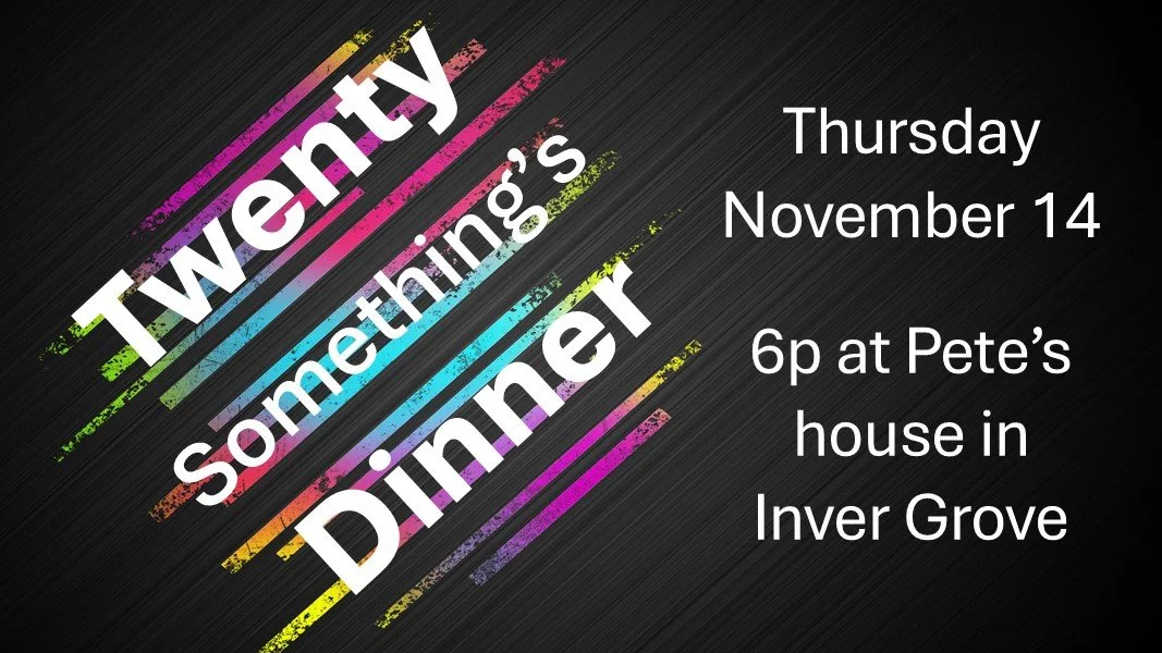 If you are a young adult in your 20’s-early 30’s, come to dinner at Pastor Pete’s house on the 2nd Thursday of each month. This month is on November 14 at 6:00p. You’ll enjoy a great meal, hang out time and prayer for each other.