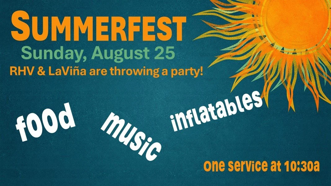 Join us on Sunday, August 25d for a PARTY. We will have one service only at 10:30a followed by a party thrown by RHV & LaViña. We’ll be inviting our Cahill Place neighbors to join us too!